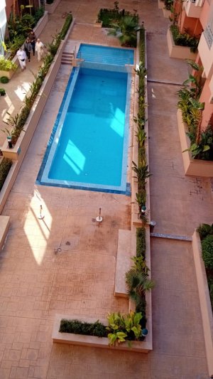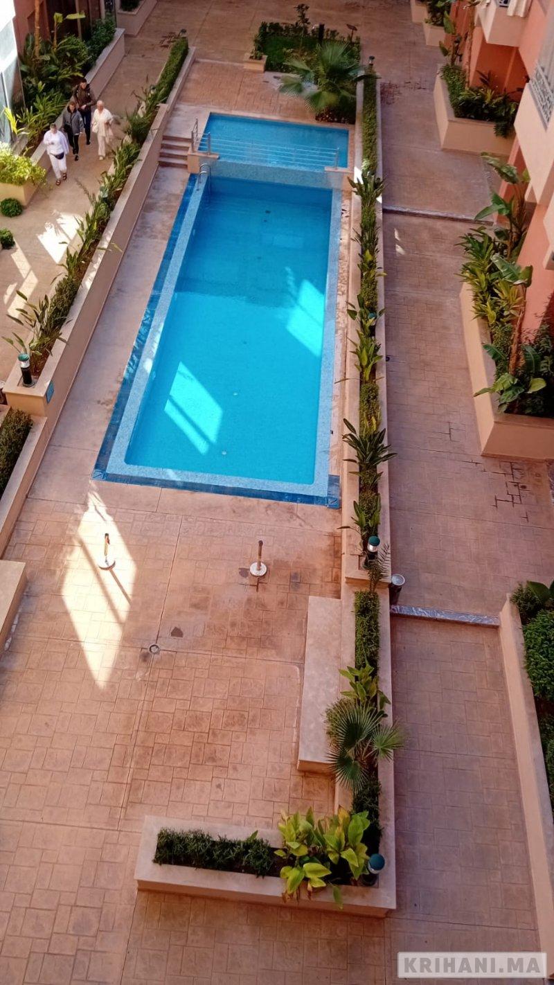 appart parfaitement meublé ,deux façades , balcon vue piscine, ascenseur devant la porte , deux appart par étage situé dans une résidence moderne surveillée avec piscine , parking sous sol et espace vert , absolument entourée de BIM, MARJANE, CAFE, RESTAURENT, MACDO et les écoles